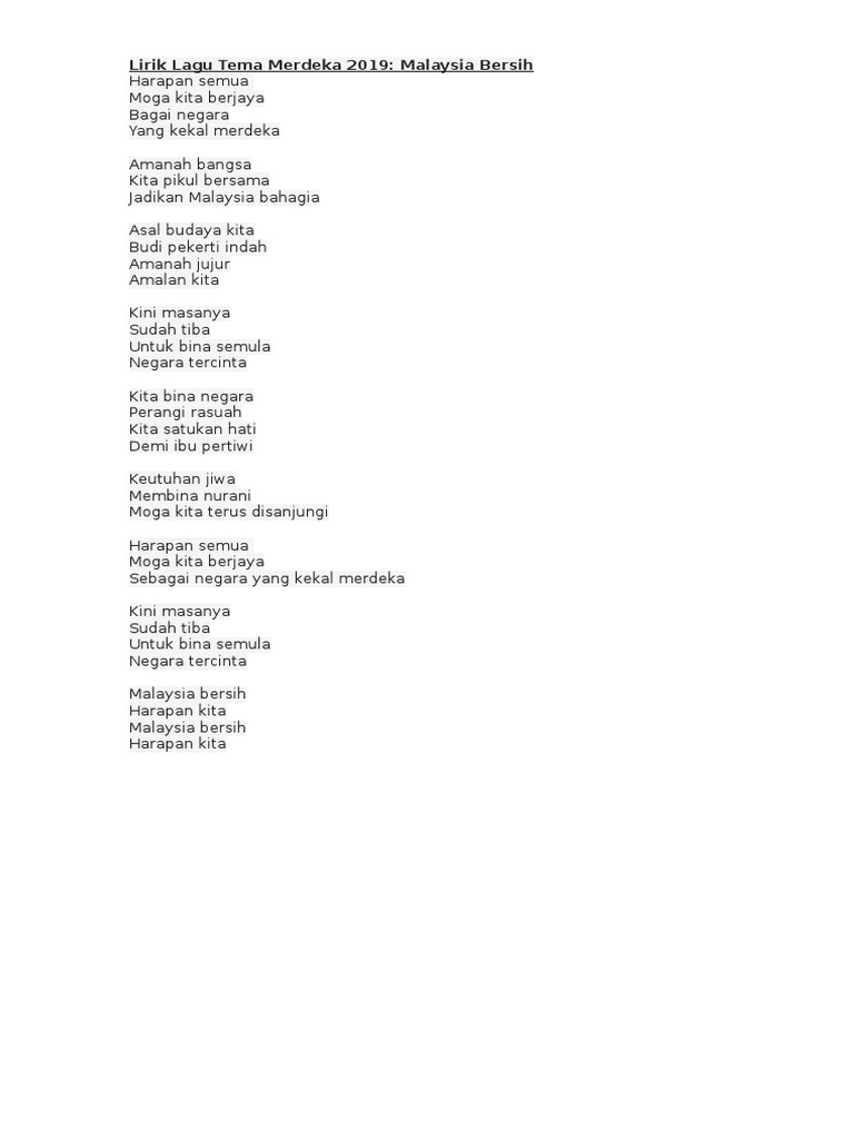 Lirik Lagu Malaysia Bersih Lagu Rasmi Hari Kebangsaan Merdeka ke 62 Hari Malaysia 2019 LIRIK LAGU MALAYSIA BERSIH HARAPAN SEMUA MOGA KITA BERJAYA BAGAI NEGARA YANG KEKAL MERDEKA AMANAH BANGSA KITA PIKUL BERSAMA JADIKAN MALAYSIA BAHAGIA ASAL BUDAYA KITA BUDI PEKERTI INDAH AMANAH JUJUR AMALAN. Hal itu dikarenakan di tanggal 17 Agustus 2019 ini masyarakat Indonesia. Hm No weapon formed against me shall ever prosper.